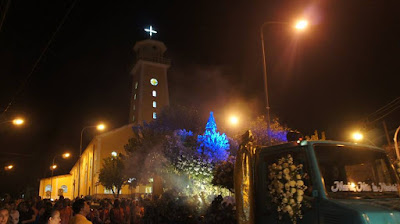 foto:Arquivo pessoal,foto tirada por mim em 4 de junho de 2017,festa do padroeiro. Mostrando a igreja e a cruz e a torre ao lado.